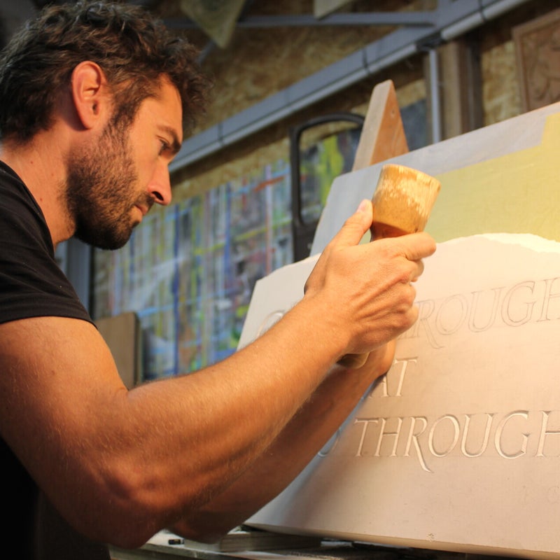 L'essentiel de mon activité s'inscrit dans la gravure de lettres et de signes. Je réalise tout à la main, de l'ébauche au dessin de composition sur papier, puis au tracé sur la pierre qui mène à la gravure. Je suis également tailleur de pierre et à ce titre j'interviens sur du bâti pour restaurer murs en pierres, escaliers, encadrement de porte ou de fenêtre, ou tout type d'élément en pierre de taille.