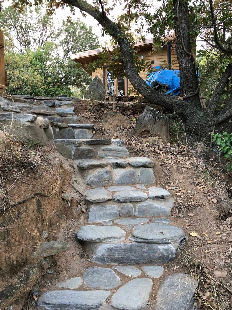 Création d'un escalier en pierres de rivière. 25 marches dessinées puis maçonnées dans un morceau de colline.